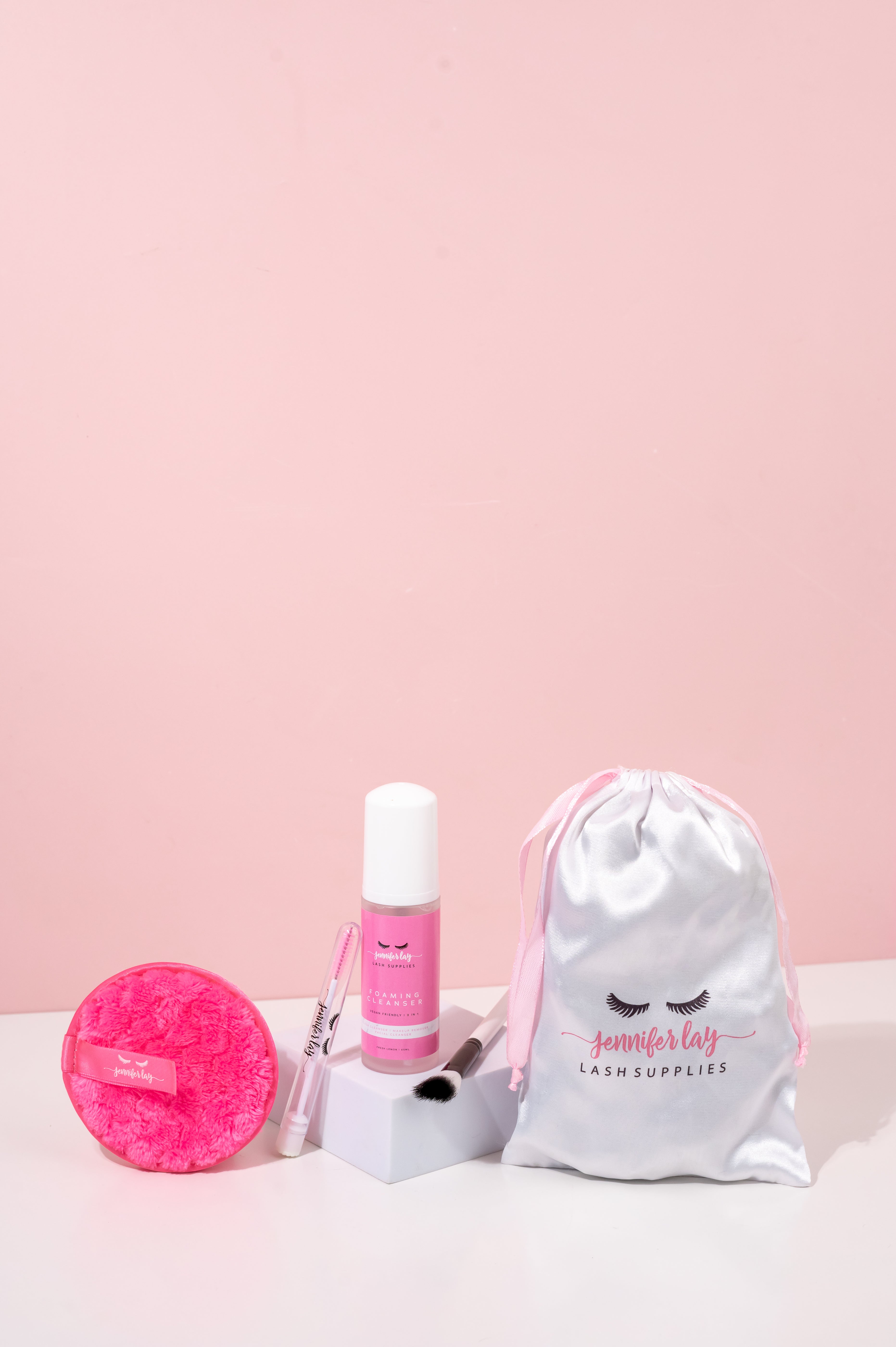Includes: 60ml lash shampoo, flat cleansing brush, re-useable makeup remover pad, luxe lash wand*.